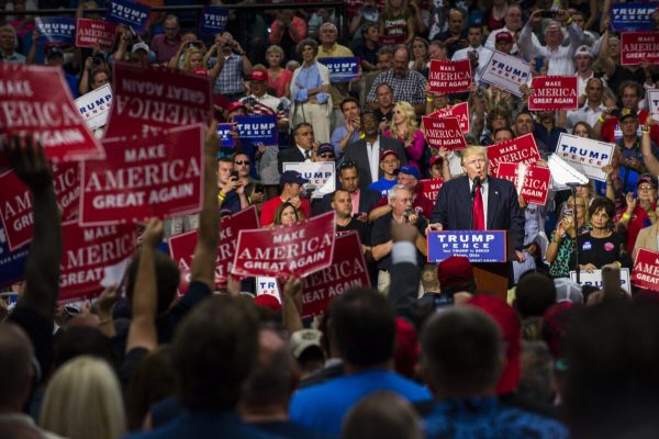 Republican Presidential candidate Donald Trump addresses supporters at the James A. Rhodes Arena on August 22, 2016 in Akron, Ohio. Trump currently trails Democratic Presidential candidate Hillary Clinton in Ohio, a state which is critical to his election bid. (Photo by Angelo Merendino/Getty Images)